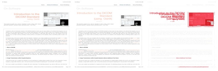 The last step is to stitch the three-way diff view images together into a complete report for each set of PDF documents considered. In this step, the previously stitched three-way images are then stitched one more time (this time horizontally) to create a full listing of all pages compared as well as the differences if any. This is achieved by using the convert program used in the previous step as well. A small PowerShell function that performs this operation is shown below. The code needed in the main routine to invoke this function above is shown below. Again, these lines follow from where we left of previously in Step 4. The full diff report produced is also shown below. As you can see, such a report enables one to quickly see all the differences for every PDF document compared very easily.